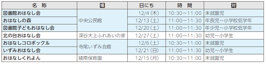 絵本の読み聞かせ、紙芝居など。最新情報は、同館ホームページ【URL】https://www.ayaselib.jp