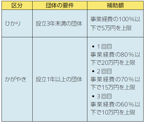 対象:市内に活動拠点がある3人以上の団体が行う、主に市民を対象とした公益的な事業