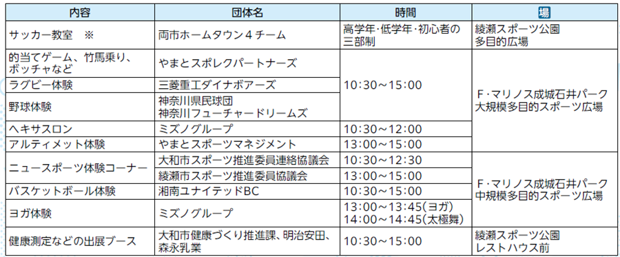 大和市と共同し、イベントを実施します。当日は、サッカー、野球、ラグビーなどさまざまなスポーツを体験することができます。ニュースポーツ体験コーナーでは、グラウンド・ゴルフやモルックなどを実施します。その他健康ブースではご自身の健康状態を確認できるようなブースを出展します。